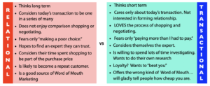 Transactional connections are more self-serving. Typically, transactional approaches are short-term engagement methods aimed at getting something with minimal fuss. Transactional relationships are often temporary, can be taxing on the mind and body and are all about the short-term. Get what you want, and win the sale without much thought to the customer’s needs or the longer-term.