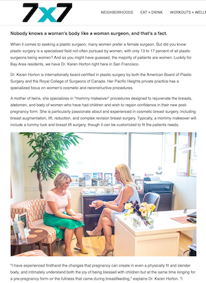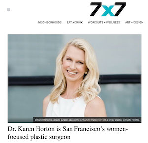 San Francisco Plastic Surgeon Dr. Karen Horton was recently featured in 7×7 Magazine (the actual dimensions in miles of the city and county of San Francisco!) in an article that celebrates her focus on the needs of women. 7×7 is a premier lifestyle guide that shares regional stories and recognizes the best that the San Francisco Bay Area has to offer. Read the full article.