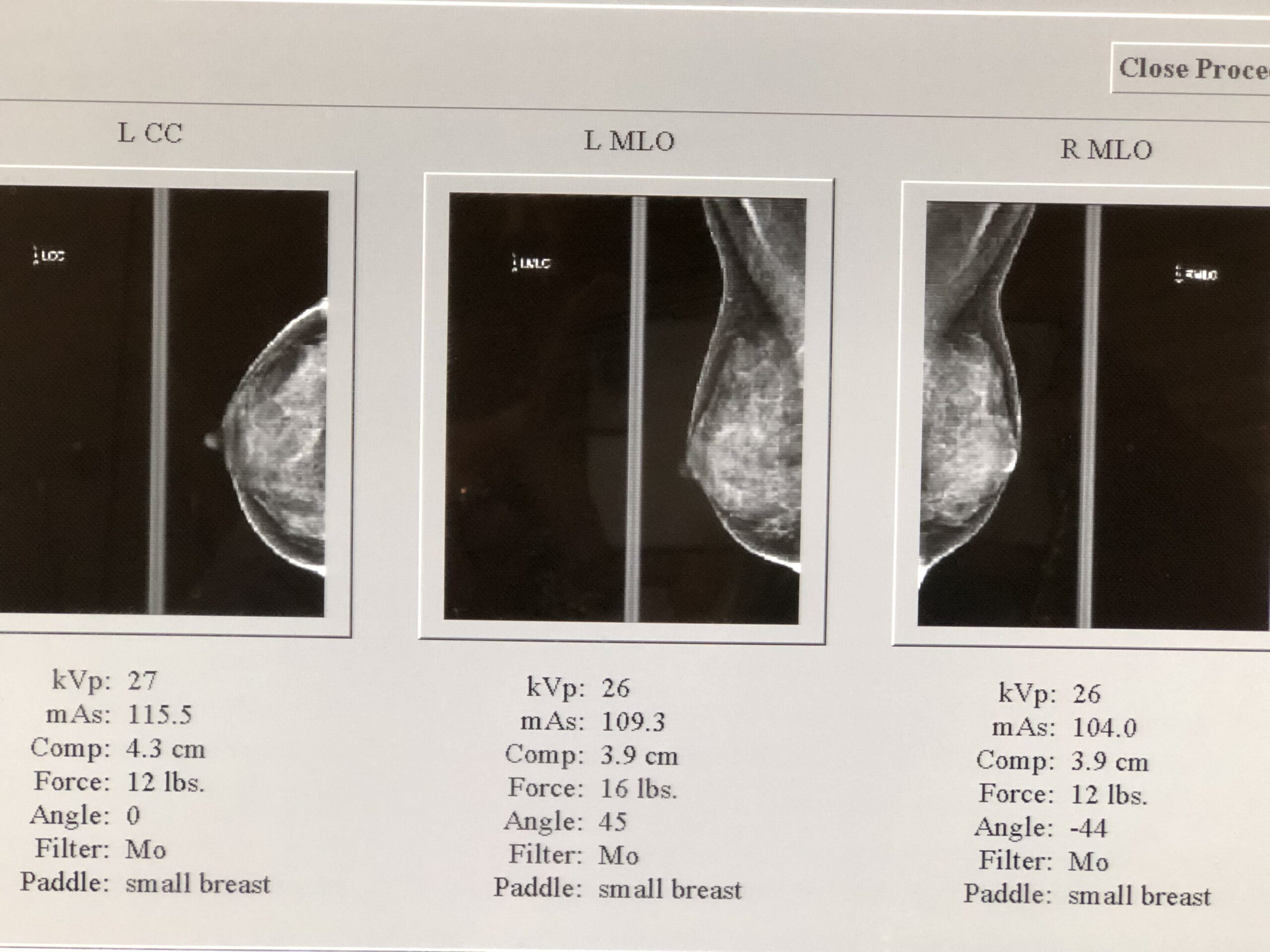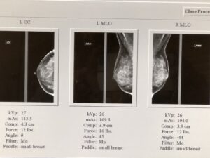 Below are my actual mammogram images from a month before I had my breast augmentation in 2019. My breast tissue is dense (very white) with little fat, so the image does not have much black space.