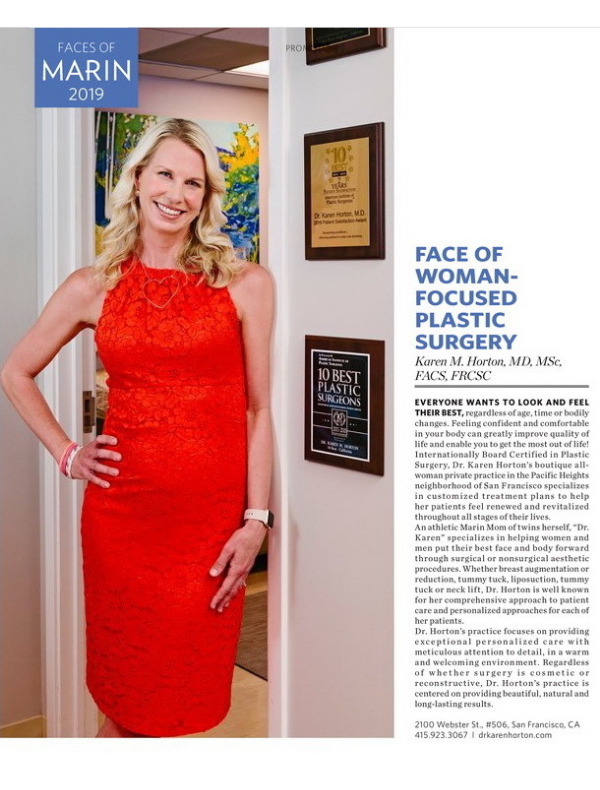 Dr. Karen Horton recently appeared in Marin Magazine for their 2019 Faces of Marin feature, which highlights local business owners in the Bay Area. Dr. Horton was recognized for her dedication to offering advanced surgical and non-surgical treatments that “help her patients feel renewed and revitalized throughout all stages of their lives.”