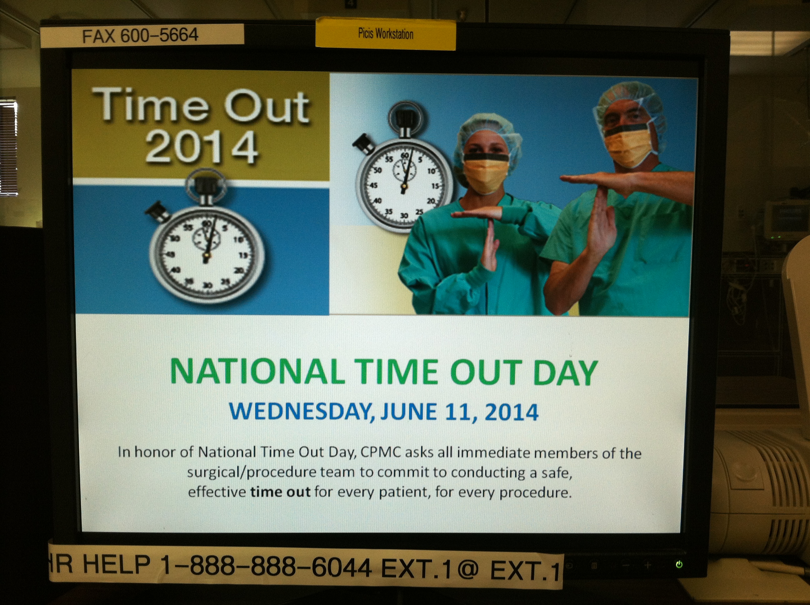 Wednesday, June 11th 2014 is National Time Out Day! Who knew? I just found out today! See the photo I took of the recovery room computer screen at the Davies campus of CPMC, where I bring my patients for surgery.