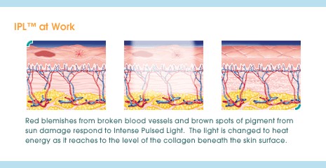 How does IPL work?  Intense pulses of light penetrates the tissue being treated and is absorbed by red pigments (such as broken blood vessels or red/pink scars) or brown pigments (such as melasma, age spots, sun spots or freckles).  IPL only affects the unwanted pigments and protects the surrounding healthy tissue. The body’s natural processes then remove the injured tissue, giving the skin a more even tone and youthful appearance. The energy produced by IPL works directly on the top layers of the skin without penetrating deep enough to harm deeper structures.