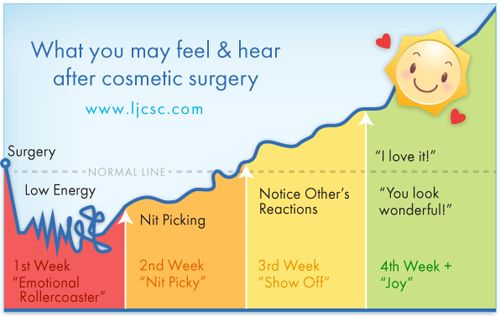 Likewise, with Plastic Surgery, there are common emotional ups and downs that patients go through in the time period after surgery, illustrated above. There can include: