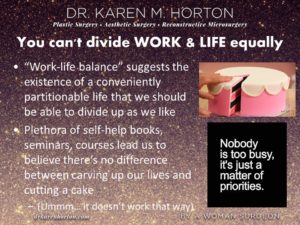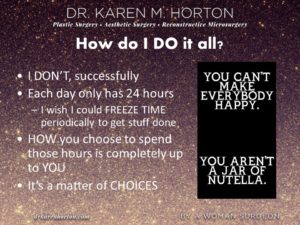 Is it possible to juggle all these balls, successfully? Nope! I DON’T really “do it all”, in the traditional sense. Every day has 24 hours, and during the hours I am awake (probably a few more than most people, since I don’t need as much sleep as some) – like all Plastic Surgeons – I need to get a LOT done!