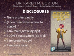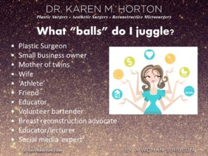 ~ Karen Horton, M.D. (Plastic Surgeon, Mom of twins, wife, daughter, sister, social media maven, educator, bartender, volunteer, athlete, breast reconstruction advocate,…)