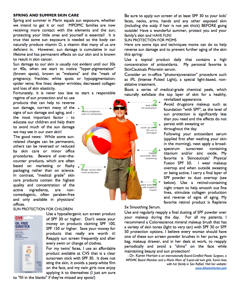 An article by Dr. Karen Horton was recently featured in the Marin Parents of Multiples Club (MPOMC) newsletter. In the article, the San Francisco, Board-Certified Plastic Surgeon shares her advice for helping reduce, and even reverse, the harmful effects of the sun. As a mother of twins herself, Dr. Horton is familiar with the challenges, as well as fun outdoor opportunities, warmer weather brings. Click the image above to enlarge the article and read about Dr. Horton’s spring & summer sun tips!
