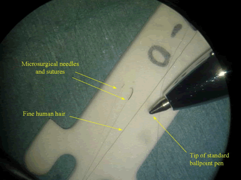 Utilizing magnification up to fifty times that produced by the naked eye and stitches finer than a hair, surgeons are able to repair transected blood vessels and nerves far smaller than the human eye can discern.