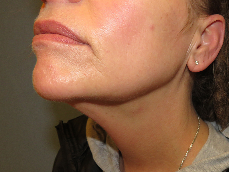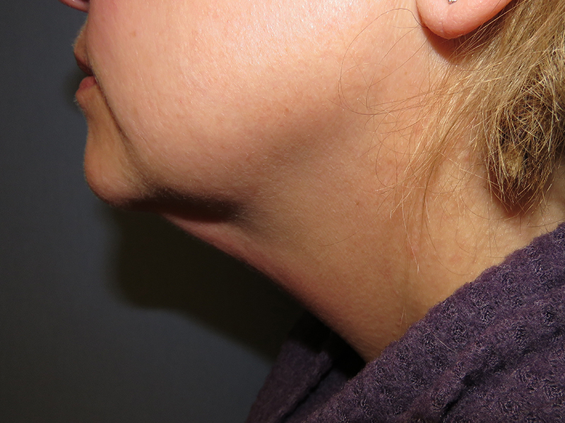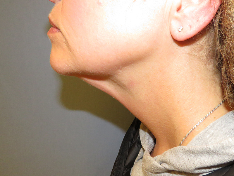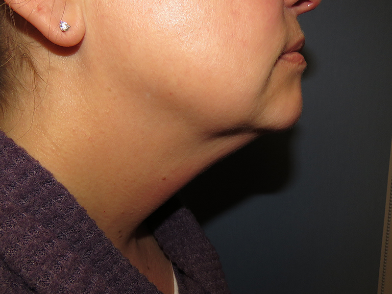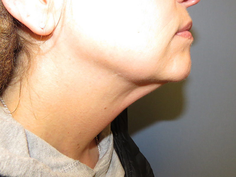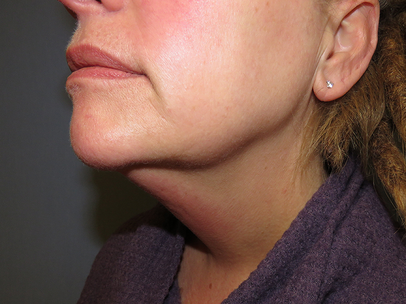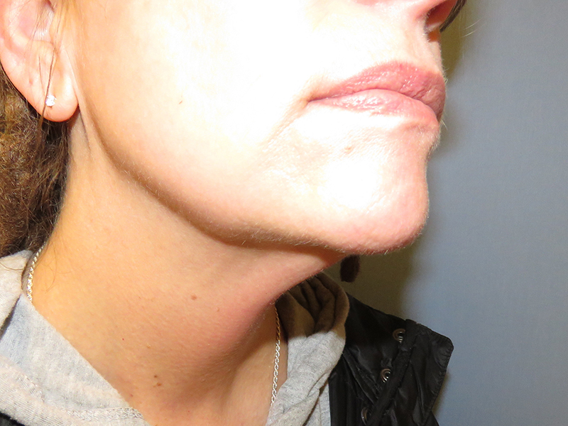 Liposuction removed excess fat from under her chin and her jowl region through two teeny incisions. After surgery, she wore a compressive chin strap until the bruising completely resolved (two and a half weeks).